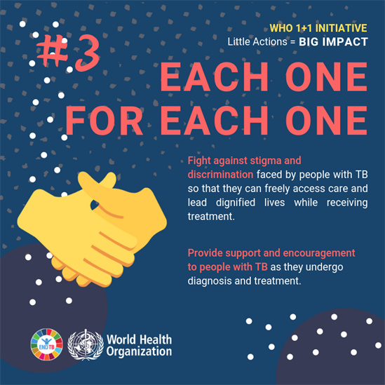 To address this, in 2019, WHO launched a special youth initiative titled 1+1- to call for youth mobilization to boost the fight to end TB. The initiative aims at advancing engagement with young people and amplifying their voices to end TB. Youth can have a multiplier effect in the fight to end TB, to accelerate progress towards reaching the ambitious 2022 targets of the UN high-level meeting on ending TB, as well as the larger goal of ending TB by 2030, as included in the WHO End TB Strategy and the SDGs. This was followed by a Global Youth Townhall to end TB that culminated in a Youth Declaration to End TB. WHO is working with young people around the world to strengthen their engagement and implement the declaration.