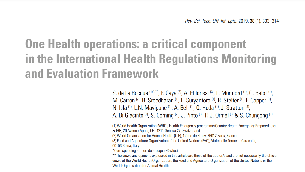 WHO works together with international organizations and national institutions in charge of animal health to improve the rapid detection of emerging pathogens and to ensure coordination in rapid control measures. By strengthening the contribution of the veterinary sector in the implementation of the IHR (2005), WHO and its partners propose guidance, methods, and tools to jointly review synergies and gaps in the coordination between the two sectors and to support countries in the operationalization of a multisectoral, One Health approach for global health security.