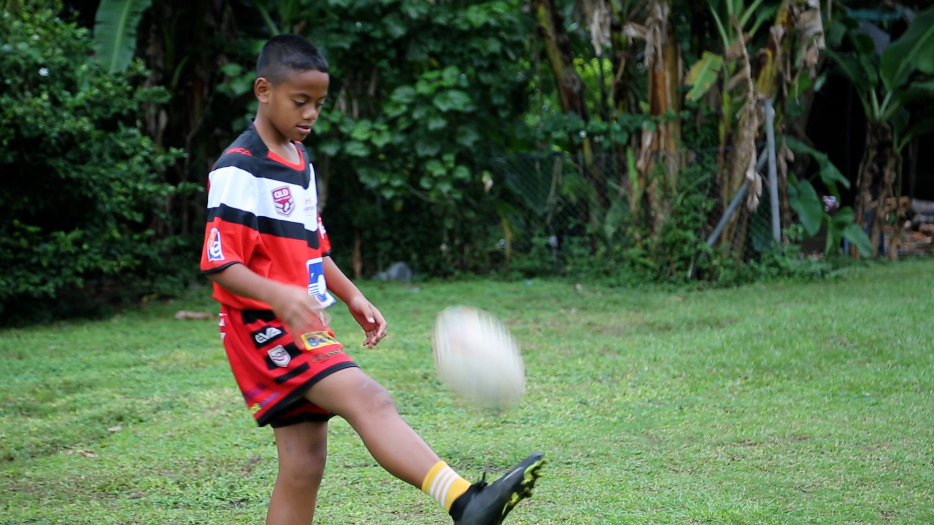 Ilifeleti, 11 years old, kicks a rugby ball during training. Photo: WHO/Renagi Taukarai