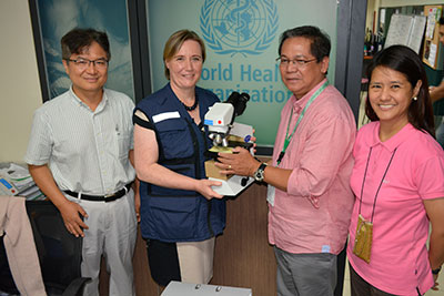 WHO Representative in the Philippines Dr Julie Hall, and WHO Medical Officer for TB Dr Woo-Jin Lew formally hand over one of the fifty high powered biological microscopes to the Department of Health’s Director of the Infectious Disease Office Dr Mario S. Baquilod. The microscopes, which were donated by the people of Japan, would enable laboratories in calamity afflicted areas to conduct sputum examinations to help in the diagnosis of Tuberculosis.