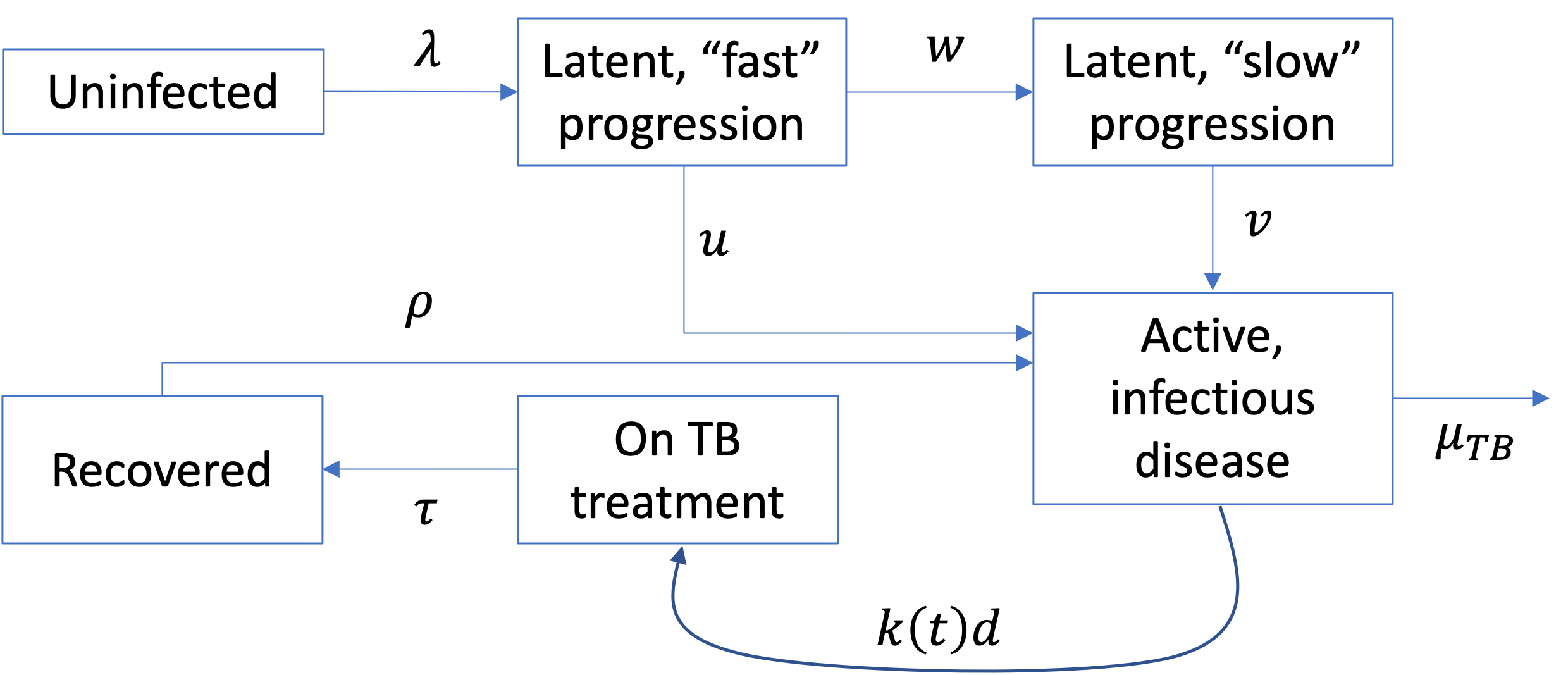 | Per-capita rate of self-cure in the absence of treatment | 0.67 (0.50, 0.84) | (4), parameters determined so that untreated TB case has an average duration of 3 years with CFR of 50% |