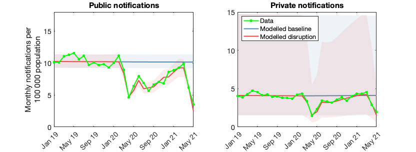 Data (in green) show notifications from the public and private sectors, on a month-to-month basis. Red lines show model projections, created by choosing a time series for k(t) in Fig. 1 that matches closely with the data. Shaded areas show 95% Bayesian credible intervals.