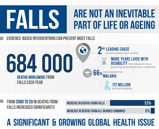 Falls take the lives of 684 000 people each year. Beyond the death toll, 172 million more people experience disabilities arising from a fall each year. Falls are not only a significant global public health problem – they are a rapidly growing one. Fall-related deaths have risen far faster than any other type of injury over the last two decades. Many factors account for this increase – ageing populations and patterns of urbanization chief among them.